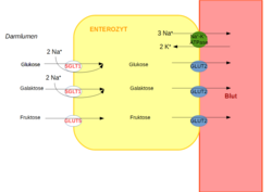 Alle drei Zucker gelangen dann durch den Transporter GLUT2 (Glucose Transporter 2) ins Blut. Triebkraft für den Transport ins Blut ist der Gradient: Im Enterozyten ist die Konzentration der drei Monosaccharide also vergleichsweise hoch und im Blut vergleichsweise gering, so dass die Monosaccharide einfach in Blut diffundieren können.[40]