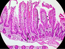 Der Dünndarm ist hauptsächlich für die Absorption von Kohlenhydraten, Proteinen und Fetten verantwortlich[39] – Wasser und Elektrolyte werden auch im Dickdarm absorbiert. Die Aufnahme von Nahrungsstoffen wird durch die große Oberfläche des Dünndarms begünstigt und geschieht im Wesentlichen über Transportvorgänge in die Enterozyten. Dazu erzeugen die Enterozyten einen Konzentrationsunterschied, einen Gradienten von Natrium und Kalium gegenüber ihrer Umgebung. Dieser Gradient ist die treibende Kraft, um Nahrungsbestandteile in die Dünndarmzelle zu transportieren. Man unterscheidet zwei Formen der Stoffaufnahme: den transzellulären Transport und den parazellulären Transport. Unter transzellulärem Transport versteht man die Aufnahme über spezielle Transportproteine. Das heißt, diese speziellen Transportproteine transportieren die Stoffe in die Zelle hinein, unter Umständen auch entgegen ihrem Gradienten (Konzentrationsgefälle). Der parazelluläre Transport hingegen erfolgt entlang eines Gradienten zwischen den Zellen hindurch.[40]