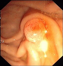 Tumoren des Dünndarms sind beim Menschen selten, sie machen nur etwa 3 % aller Tumoren der Verdauungsorgane aus. Es gibt keine charakteristischen Symptome: die Tumoren können krampfartige Bauchschmerzen hervorrufen, Blut absondern oder durch ihr Wachstum das Lumen des Dünndarms verengen. Die meisten dieser Tumoren sind gutartig. Sie gehen meistens vom Drüsenepithel aus, sie sind damit Adenome, die auch Polypen bilden können. Daneben finden sich Leiomyome (Tumoren der glatten Muskelzellen), Lipome (Tumoren der Fettzellen) und Angiome. Bösartiger Krebs ist sehr selten, findet sich aber gehäuft bei Patienten mit Morbus Crohn, Zöliakie oder AIDS. Auch die bösartigen Tumoren gehen meistens von den Drüsenzellen aus (Adenokarzinome), diese Gruppe macht etwa die Hälfte der bösartigen Dünndarmtumoren aus. Etwa jeder fünfte bösartige Tumor ist die Manifestation eines Lymphoms. Daneben gibt es Karzinoidtumoren, die am häufigsten im distalen Ileum zu finden sind, sowie Gastrointestinale Stromatumoren und Leiomyosarkome. Papillentumoren betreffen zwar den Dünndarm, sind aber keine eigentlichen Dünndarmtumoren, da sie vom Gallen- bzw. Pancreasgang ausgehen.[64]