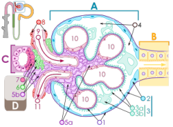 A Nierenkörperchen; B Hauptstück; C Mittelstück; D Juxtaglomeruläre Apparat