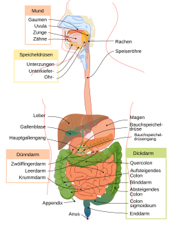 Beim Menschen findet die Verdauung hauptsächlich im Mund, Magen (Gaster), Zwölffingerdarm (Duodenum) und im restlichen Dünndarm (Jejunum und Ileum) statt. Zur Aufnahme von Nährstoffen kommt es jedoch fast nur im Zwölffingerdarm und im Dünndarm.