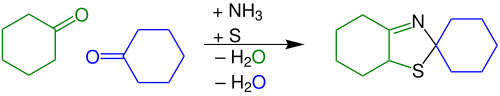 Eine universellere Variante der Asinger-Reaktion wurde bei der Degussa AG entwickelt. Dabei reagiert eine α-halogenierte Carbonyl-Komponente mit Natriumhydrogensulfid und generiert in situ eine α-Mercapto-Carbonyl-Komponente (Thiol), welche direkt mit Aldehyden oder Ketonen und Ammoniak zu 3-Thiazolinen weiterreagieren:[4]