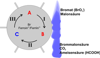 Im Anfangszustand A liegen neben den Edukten (Bromat, Malonsäure) vor allem Bromid und Ferroin in der Lösung vor. Nun kann Reaktion I ablaufen, die das Bromid verbraucht und Malonsäure bromiert. Das System geht so in den Zustand B über, in dem nahezu kein Bromid mehr vorliegt. Das Bromid hemmt schon in kleinsten Konzentrationen das Ablaufen der Reaktion II, sodass diese am Anfang keine Rolle spielt. Nun kann sie aber ablaufen und oxidiert das Ferroin, was zu einem Farbumschlag der Lösung nach blau führt. Das System befindet sich nun im Zustand C, in dem die Lösung Ferriin und kein Bromid enthält. Die Reaktion III kann nun ablaufen und reduziert das Ferriin wieder zu Ferroin, wobei auch Bromid wieder zurückgebildet wird. Außerdem entsteht noch Ameisensäure als Produkt. Dieser Zustand entspricht gerade wieder dem Ausgangszustand A.