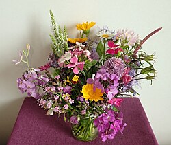 Eine wesentlich größere Rolle spielen Blüten jedoch als Schmuck in der Form von Zierpflanzen und Schnittblumen. Deutschland hat als weltgrößter Importeur von Schnittblumen im Jahr 2004 Waren im Großhandelswert von 1,1 Milliarden Euro importiert.[26] Der Weltmarkt für Schnittblumen und Topfpflanzen lag 2000 bei 6,8 Milliarden Euro.[27]