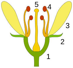 - ↑ “a flower as a determinate, compressed, bisexual reproductive axis composed of megasporangia (carpels), microsporangia (stamens) and a sterile perianth composed of at least one sterile laminar organ”. G. Theißen, R. Melzer: Molecular Mechanisms Underlying Origin and Diversification of the Angiosperm Flower. In: Annals of Botany. Band 100, 2007, S. 603–619.