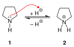 Als sekundäres Amin ist Pyrrolidin eine relativ starke Base.[4] Durch Protonierung am freien Elektronenpaar des Stickstoffs wird das Pyrrolidinium-Ion als konjugierte Säure gebildet.