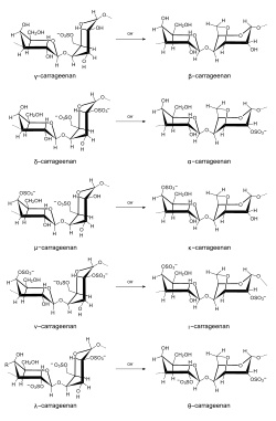 Zur Herstellung von Carrageen aus Rotalgen werden die Algen gewaschen und in alkalischer Lösung gekocht. Bei der Behandlung mit Alkalien kann durch intramolekulare nukleophile Substitution – Hydrogensulfat ist die Abgangsgruppe – ein Tetrahydrofuran-Ring bilden. Dadurch entsteht die 3,6-Anhydrogalactose-Struktur.