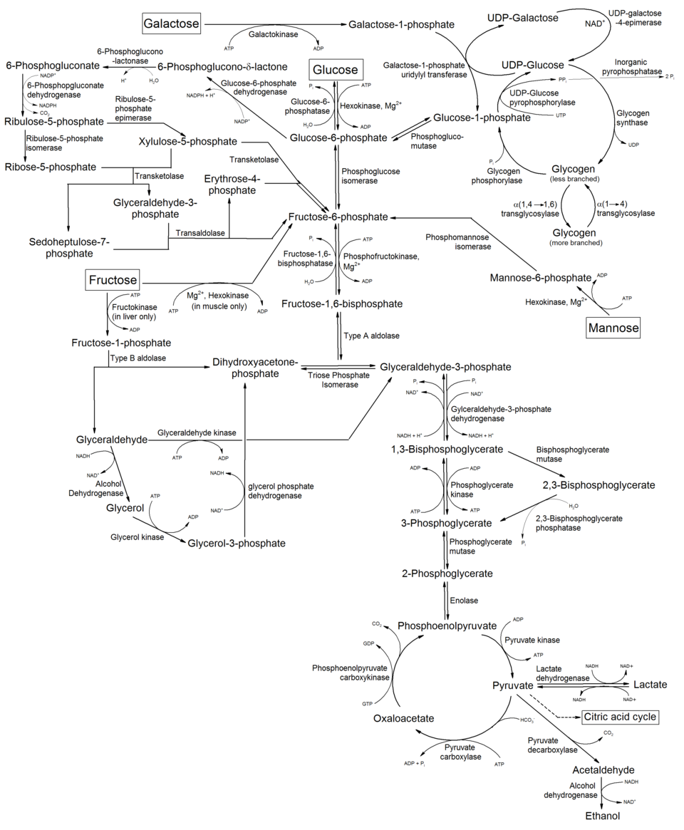 Von 1850 bis 1857 führte Claude Bernard Studien über Glykogen und Zuckerbildung in der Leber durch.[24] Für die Aufklärung des Stoffwechsels der Glucose erhielt Otto Meyerhof 1922 den Nobelpreis für Physiologie oder Medizin.[25] Hans von Euler-Chelpin erhielt zusammen mit Arthur Harden im Jahr 1929 den Nobelpreis für Chemie für ihre Forschung über die „Zuckervergärung und deren Anteil der Enzyme an diesem Vorgang“.[26][27] Im Jahr 1947 erhielten Carl und Gerty Cori für ihre Entdeckung der Wiederverwertung der im Muskel durch Glycolyse produzierten Milchsäure für die Gluconeogenese und Glycogensynthese in der Leber sowie Bernardo Houssay für seine Entdeckung der Rolle der Hypophysenhormone im Glucosestoffwechsel den Nobelpreis für Physiologie oder Medizin.[28][29][30] Für die Entdeckung der aus Glucose gebildeten Zucker-Nukleotide bei der Biosynthese von Kohlenhydraten erhielt Luis Leloir im Jahr 1970 den Nobelpreis für Chemie.[31]