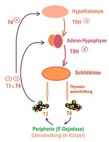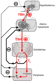 Die Hypophyse schüttet das Steuerhormon Thyreotropin (TSH) aus, das in der Schilddrüse die Sekretion von Thyroxin (T4) und Triiodthyronin (T3) anregt. Die Schilddrüsenhormone ihrerseits hemmen im Sinne einer Gegenkopplung (negatives Feedback) die Produktion und Ausschüttung von TSH, so dass sich normalerweise ein Gleichgewichtsspiegel der Menge an Schilddrüsenhormonen im Blut einstellt. Die Produktion und die Ausschüttung des TSH hängen zudem von dem Spiegel des Thyreoliberin (TRH) ab, das vom Hypothalamus produziert und ausgeschüttet wird. Der Hypothalamus gibt den Sollwert der Schilddrüsenhormone im Blut vor und misst ständig den Istwert. Um den Istwert der Schilddrüsenhormone im Blut an den Sollwert der Schilddrüsenhormone im Blut anzupassen, kann der Hypothalamus die Produktionsmenge an TRH und damit die Produktionsmenge an TSH und Schilddrüsenhormonen beeinflussen.