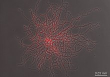 Ähnlich wie bei den Pilzen kann man auch beim Wachstum von Streptomyces zwischen zwei Typen unterscheiden: Das Substratmyzel, das sich im flüssigen oder festen Nährmedium ausbreitet und das in den Gasraum darüber hineinwachsende Luftmyzel. An den Enden der Filamente des Luftmyzels werden bei älteren Kulturen wieder Querwände in den Zellwänden ausgebildet, so dass durch Segmentierung Ketten von mehreren, meist kugelförmigen Sporen gebildet werden. Diese, als bakterielle Exosporen anzusehenden Sporen unterscheiden sich somit grundlegend von den Endosporen, die z. B. von den Bakteriengattungen Clostridium und Bacillus gebildet werden.[1]