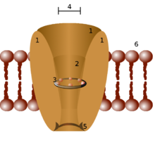 Schematischer Aufbau eines Ionenkanals mit 1 als Proteinuntereinheit (meistens 4), 2 als Außenbereich, 3 als Selektor, 4 als Durchmesser des Kanals, 5 als Phosphorylierungsstelle und 6 als Zellmembran