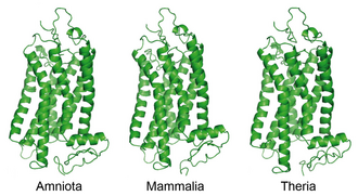 - ↑ z. B. das anzestrale Rhodopsin der Amnioten, Säugetiere (Mammalia) und Höheren Säugetiere (Theria), siehe Constanze Bickelmann, James M. Morrow, Jing Du, Ryan K. Schott, Ilke van Hazel, Steve Lim, Johannes Müller, Belinda S. W. Chang: