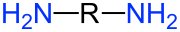 ![]() Allgemeine Struktur eines Diamins. Die primären Amino-Gruppen (NH2) sind blau markiert, R ist ein zweibindiger organischer Rest (z. B. eine para-Phenylengruppe). |