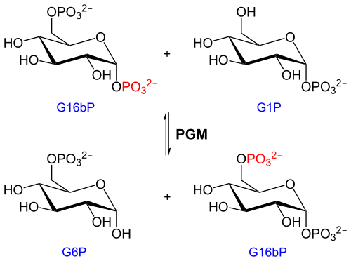 Katalysiert wird die Umlagerung von der Phosphoglucomutase (PGM). Hierbei wird eine Phosphatgruppe des enzymgebundenen Moleküls α-D-Glucose-1,6-bisphosphat übertragen.[6] Da bei der Reaktion ebenfalls G16bP als wieder regeneriertes Cofaktor entsteht, erscheint dieses nicht in der Bruttoreaktionsgleichung: