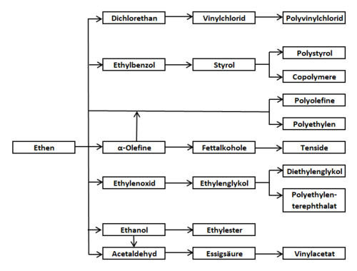 Mit einer Jahresproduktion von über 100 Millionen Tonnen ist Ethen die meistproduzierte organische Basischemikalie. Ethen ist ein wichtiger Baustein, der in der chemischen Industrie zur Herstellung einer Vielzahl von Folgeprodukten verwendet wird. Etwa die Hälfte des Ethens wird für die Produktion von Polyethylen und anderen Polyolefinen verwendet. Weitere großtechnisch hergestellte Folgeprodukte sind Ethylenoxid, Styrol, Vinylchlorid, Ethanol oder α-Olefine.