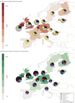 Der Mensch nimmt Flavonoide mit der Nahrung in größeren Mengen auf. Rund zwei Drittel der rund ein Gramm umfassenden phenolischen Substanzen, die der Mensch täglich zu sich nimmt, sind Flavonoide. Die Hauptgruppe sind dabei Flavanole (insbesondere in Ländern mit Teekonsum).[14] Über lange Zeit wurde angenommen, dass die potentielle Wirkung von Flavonoiden auf deren antioxidativen Effekten beruht,[3] allerdings wird das zunehmend angezweifelt und andere Wirkungsweisen sind wahrscheinlicher.[17]
