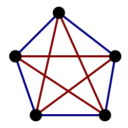 Eine mögliche 2-faktorisierung von {\displaystyle K_{5}} (dem vollständigen Graphen mit 5 Ecken) in zwei 2-faktoren (Blau und Rot)